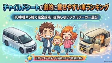チャイルドシートの乗せ降ろしやすさを「スライドドア開口部・室内高・ステップ高・ISOFIX位置・2台設置余裕」の5軸で10車種を採点。1位はノア/ヴォクシー。タントはピラーレスで軽最強。車種別の取り付け注意点と回転式チャイルドシートの干渉リスクまで完全網羅。