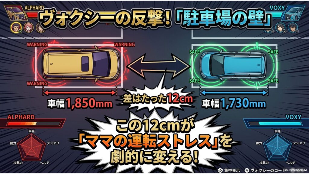 たかが12cmの違いに思えますが、この差は「古いスーパーの狭い駐車場」や「新潟市中央区の駅前のような極小月極駐車場(機械式含む)」において、極めて大きな障害となります。