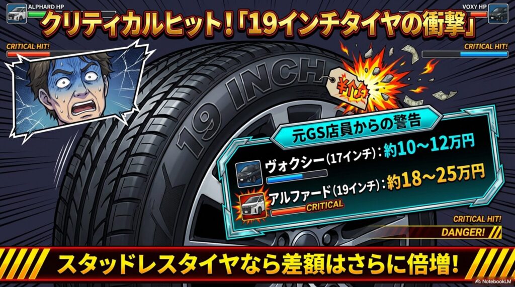アルファードの19インチタイヤを交換しようとすると、ヴォクシーの2倍〜3倍の費用が吹き飛びます。「えっ!アルファードのタイヤってこんなに高いの!?」とレジで真っ青になるパパを、私はGSで何人も見てきました。