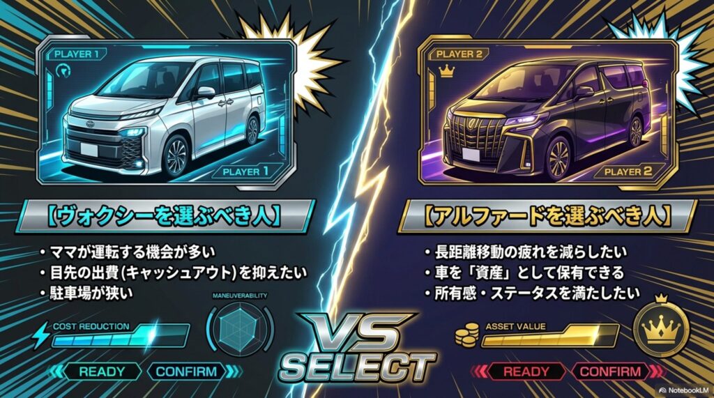 答えを先に言えば、圧倒的なステータスと驚異的なリセールバリューで実質コストを下げるアルファードか、毎年の税金・タイヤ代という目先の出費を極限まで抑えるヴォクシーか。あなたの「10年後の家計の体力と用途」が最大の決め手となります。
