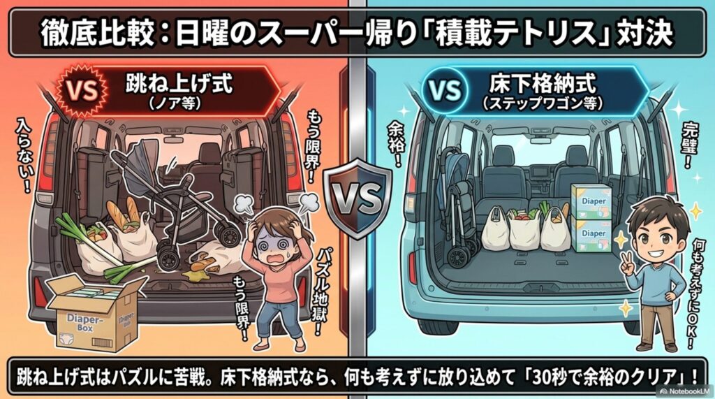 跳ね上げ式の最大の問題: ベビーカー1台だけなら入る。でもベビーカー+買い物袋3つ+おむつ段ボールを同時に積もうとすると、跳ね上げシートの出っ張りに邪魔されて「積みパズル地獄」が始まる。