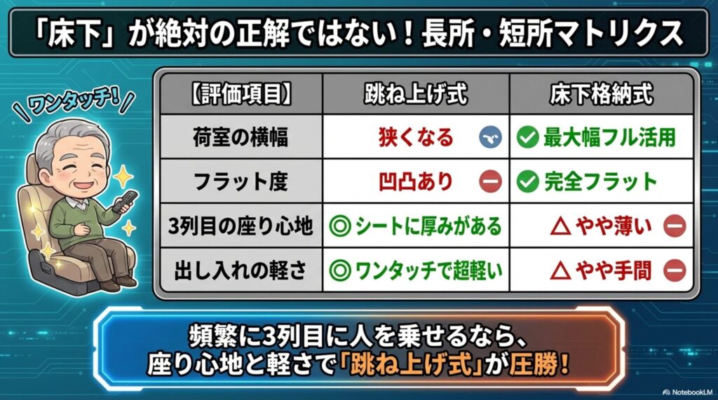 - ライフスタイルで選ぶ。 「荷物重視→床下格納式」「3列目の使用頻度が高い→跳ね上げ式」