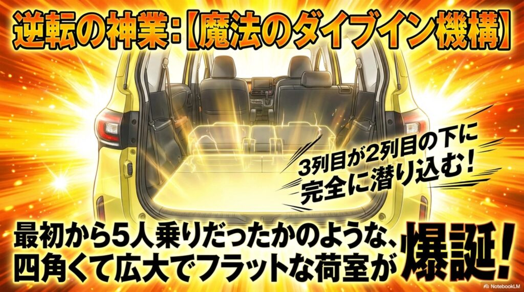 しかし、シエンタの3列目は「2列目の下に潜り込む(ダイブイン機構)」という魔法のような収納方式を採用しています。3列目を格納すると、まるで「最初から5人乗りの車だったかのように、四角くて広大でフラットな荷室」が爆誕します。