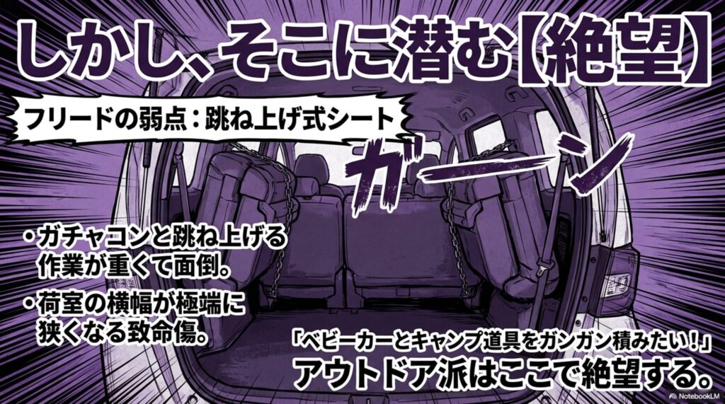 しかし、フリードの3列目は「跳ね上げ式」です。3列目を使わない時に左右の窓側にガチャコンと跳ね上げて固定するのですが、これが重くて面倒な上に、「荷室の横幅が極端に狭くなる」という致命的な弱点があります。「ベビーカーとキャンプ道具をガンガン積みたい!」というアウトドア派のパパは、ここで絶望します。