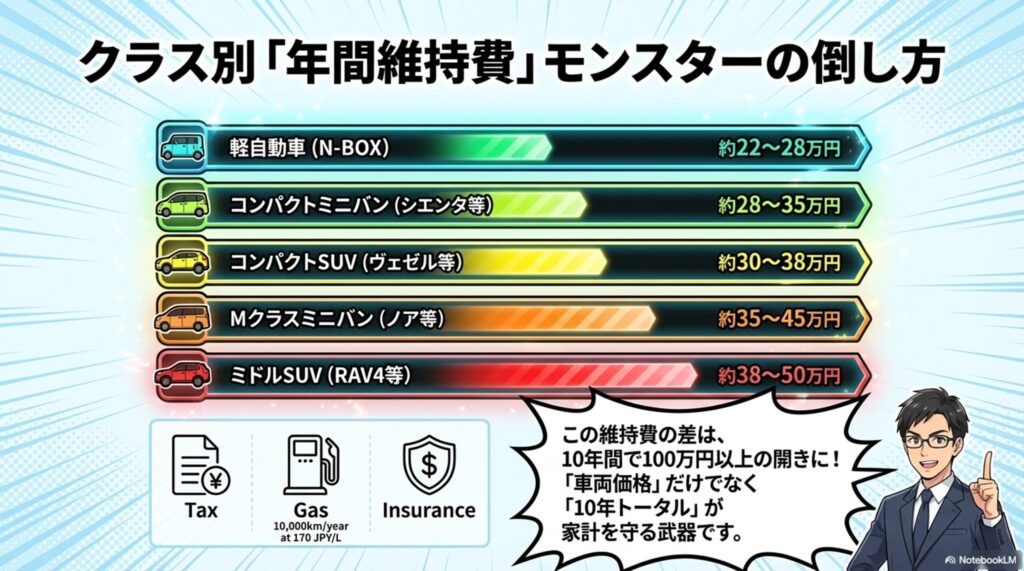 この維持費の差は、10年間で100万円以上の開きになります。「車両本体の価格」だけでなく、「10年間でトータルいくらかかるか」という視点が、家計を守る最大の武器です。