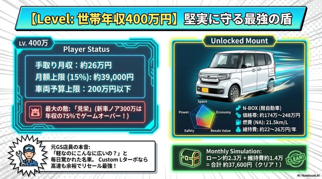 | N-BOX Custom Lターボ | 210万〜248万円 | 20.3km/L | 24〜28万円 | 400万〜500万 | リセール重視。高速も使う軽ユーザー |