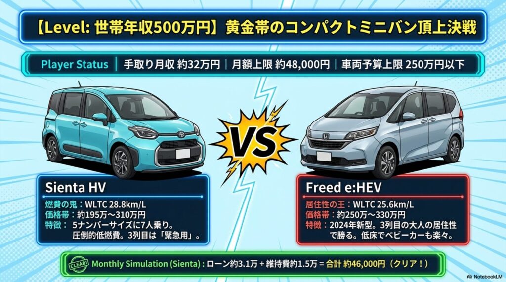 年収500万円は日本の子育て世帯のボリュームゾーンであり、同時に車選びで最も悩みが発生する年収帯です。N-BOXでは物足りない、でもノア/ヴォクシーの350万円はキツい。この「中間の苦しみ」を解決するのが、シエンタとフリードという2台のコンパクトミニバンです。