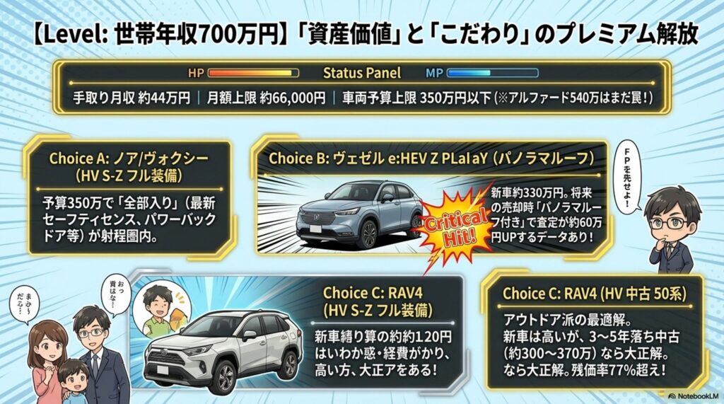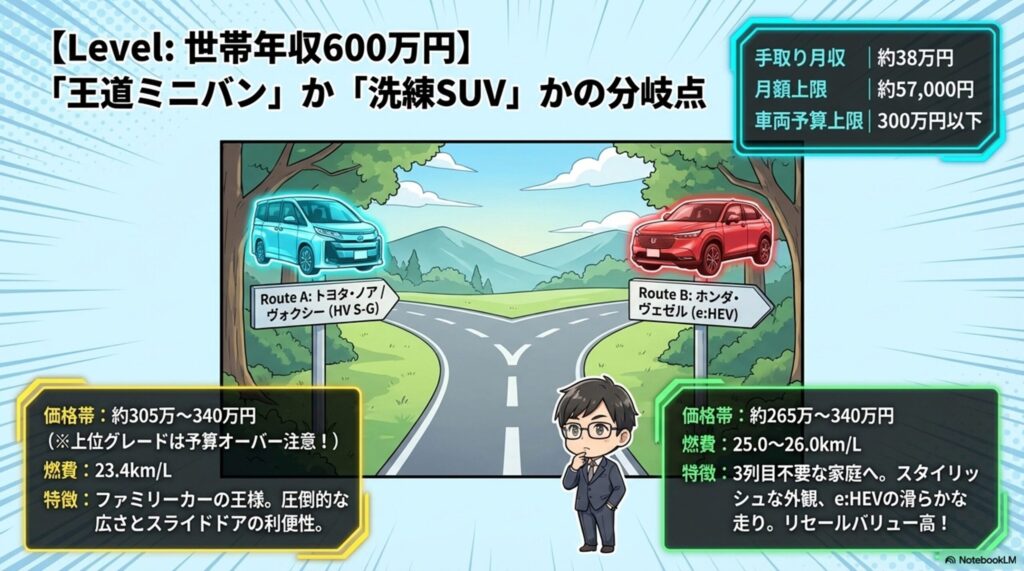 この年収帯から、ノア/ヴォクシーの上位グレード(S-Z)や、ヴェゼルの最上位グレード(e:HEV Z PLaY)を新車で買っても家計が破綻しません。ただし、ここで「予算に余裕があるから」とアルファードやハリアーに手を伸ばすのは危険です。アルファードは最低でも540万円。年収の77%です。
