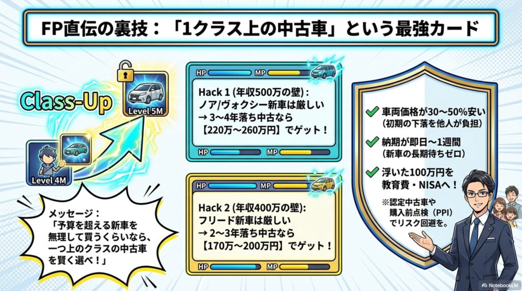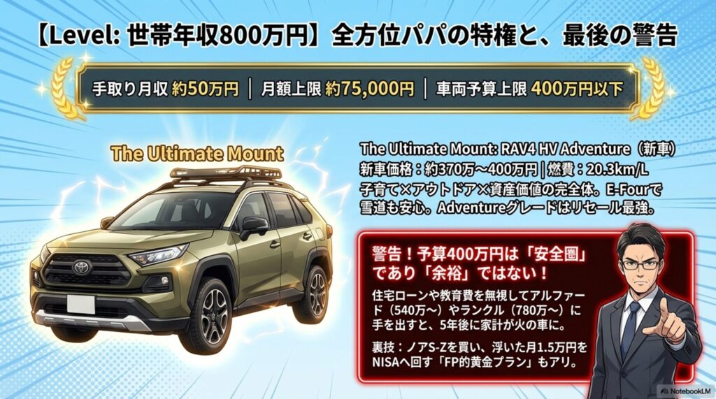 ただし、ここでFPとして一つだけ警告することがあります。予算400万円は「安全圏」であって「余裕がある」わけではありません。住宅ローンの残債、第二子・第三子の教育費、老後資金の積立。800万円の年収を持っていても、これらを無視してアルファード(540万円〜)やランクル(780万円〜)に手を出すと、5年後に家計が火の車になります。予算上限400万円を鉄の意志で守ってください。