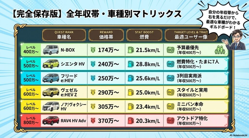 ここまでの情報を一覧にまとめます。「自分の年収帯はどこか」から右を見ていくだけで、最適な車種がわかります。