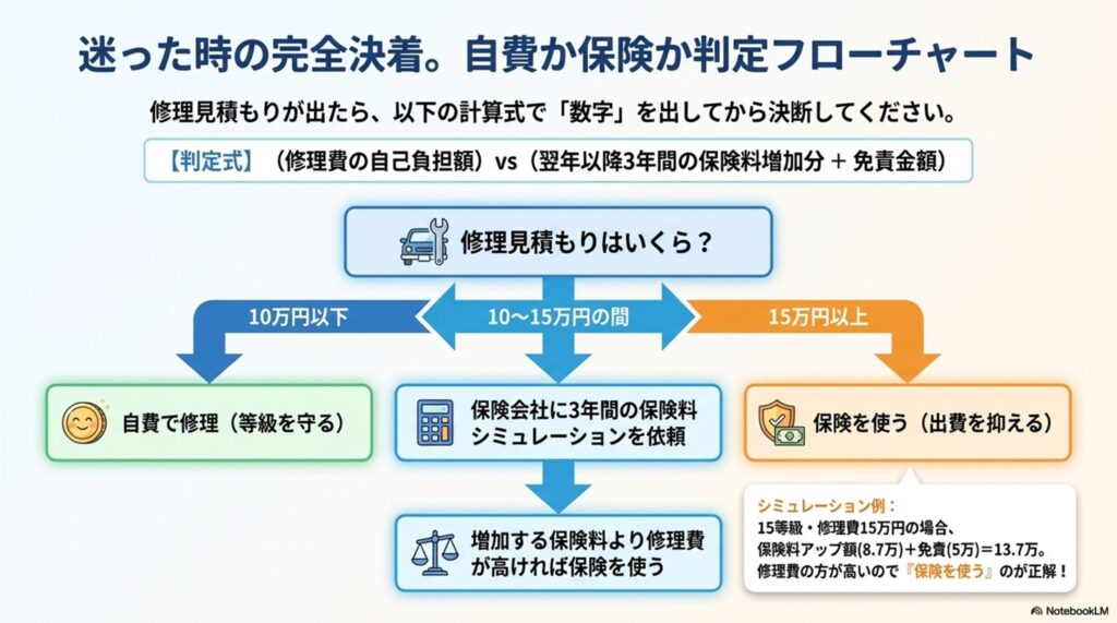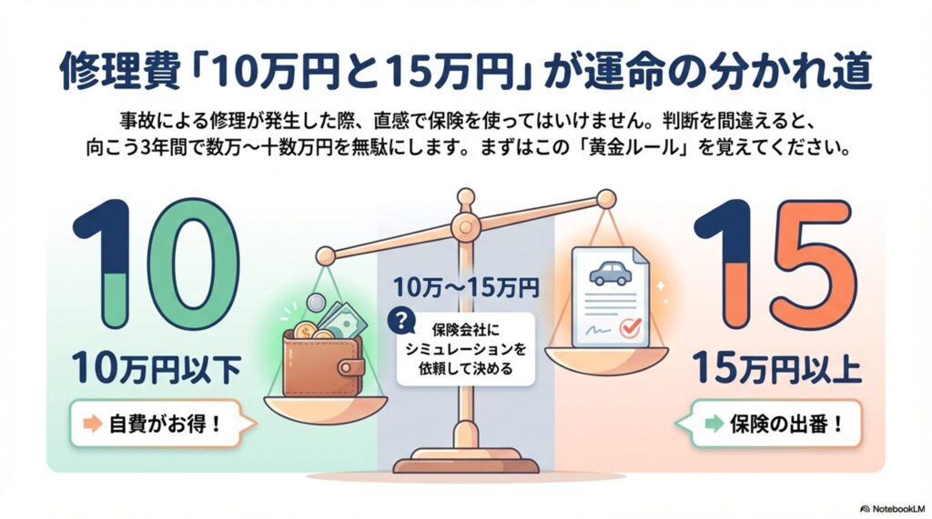 【結論】修理費10万円以下なら保険を使わず自費修理が得。15万円以上なら保険を使う。この判断を間違えると、3年間で数万~十数万円を無駄にします。