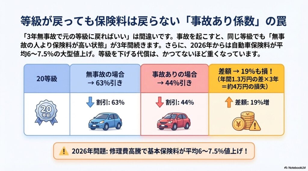 2013年から導入された「事故あり係数適用期間」という制度があり、事故を起こすと同じ等級でも「無事故の人より保険料が高い」状態が数年間続くんです。
