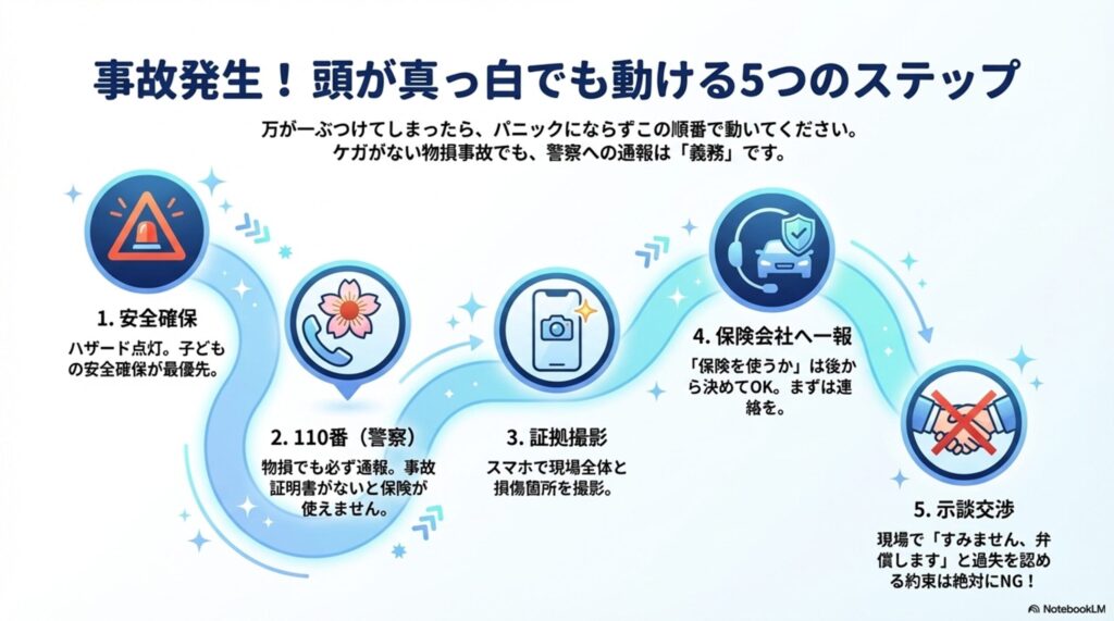 - 警察に110番(物損でも必ず通報。事故証明書がないと保険が使えない)