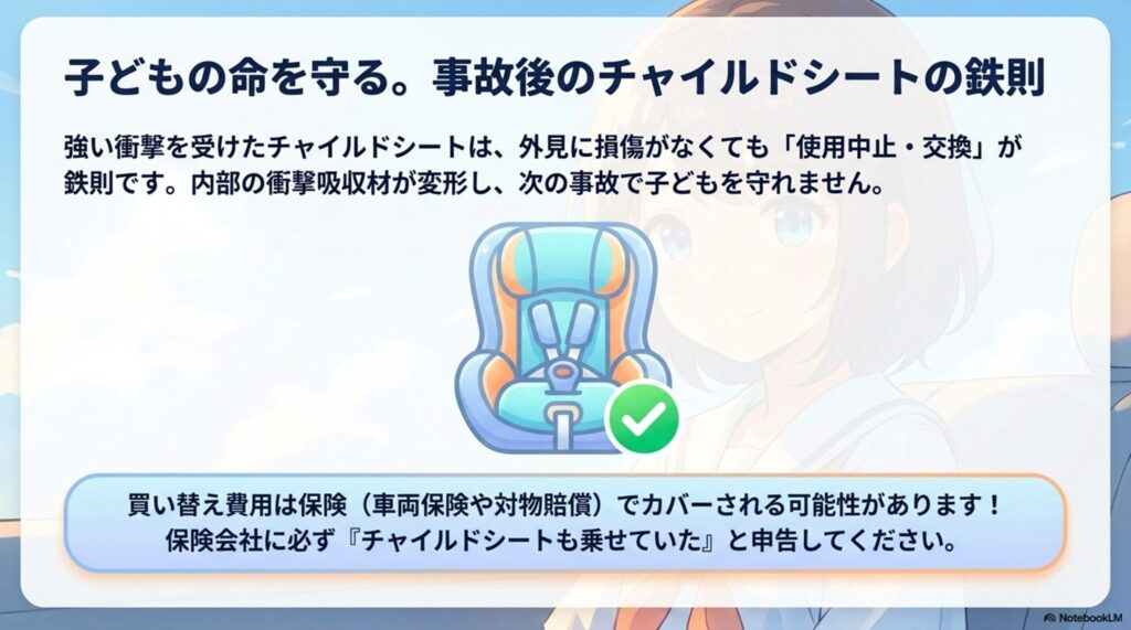 結論:チャイルドシートは事故後に交換が鉄則(保険で請求可能)。子供の心のケアも見逃さないで。