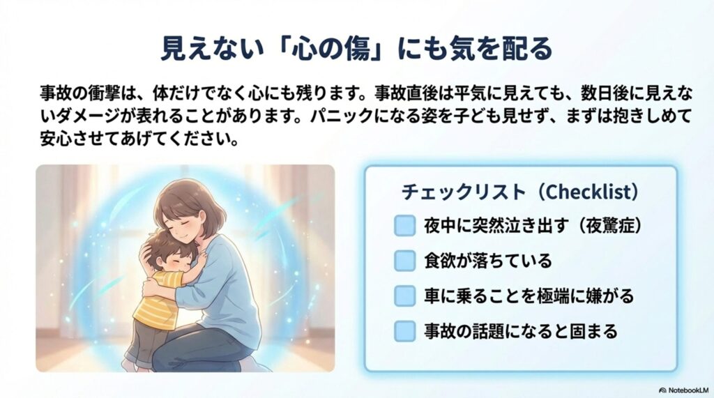 事故の衝撃は、体だけでなく心にも残ります。特に小さなお子さんの場合、事故直後は平気に見えても、数日後から以下のような症状が出ることがあります。