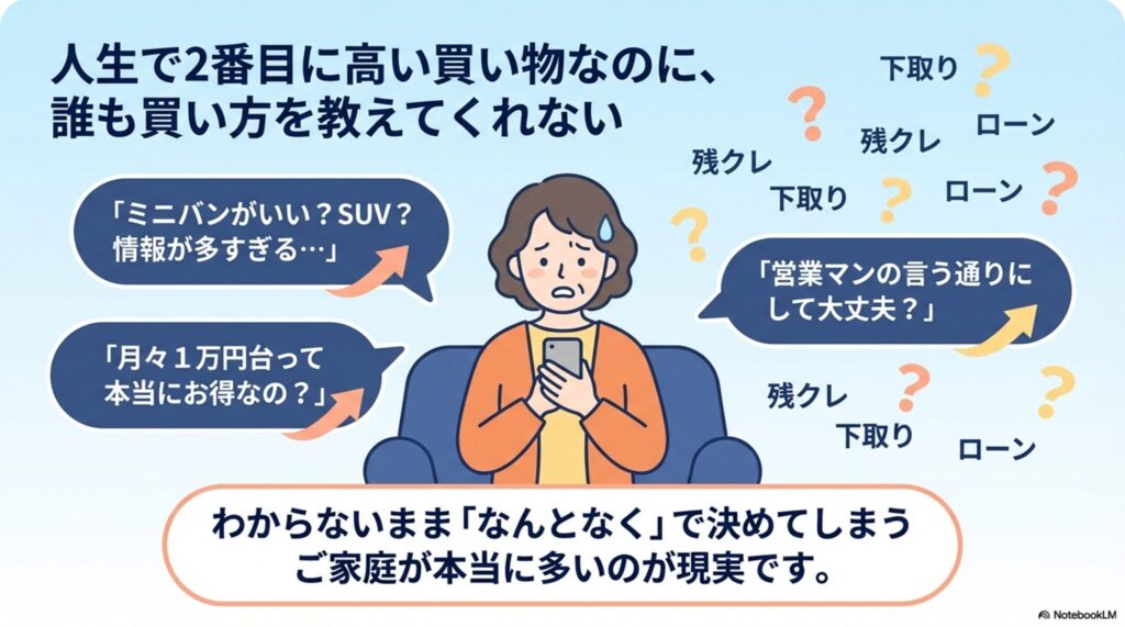 わかります。子育て中の車選びは、人生で2番目に大きな買い物(1番目は家)とも言われるのに、学校では教えてくれないし、ディーラーの営業さんは「売りたい車」を勧めてくる。何が正解かわからないまま、なんとなくで決めてしまう家庭が本当に多い。