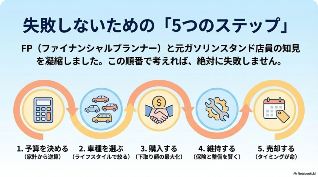 FP(ファイナンシャルプランナー)として200件以上の家計相談を受け、元ガソリンスタンド店員として何千台もの車を見てきた私が、子育て世代の車選びを5つのステップに整理しました。各ステップで「何を考えればいいか」「どう判断するか」を順番に解説していきますね。