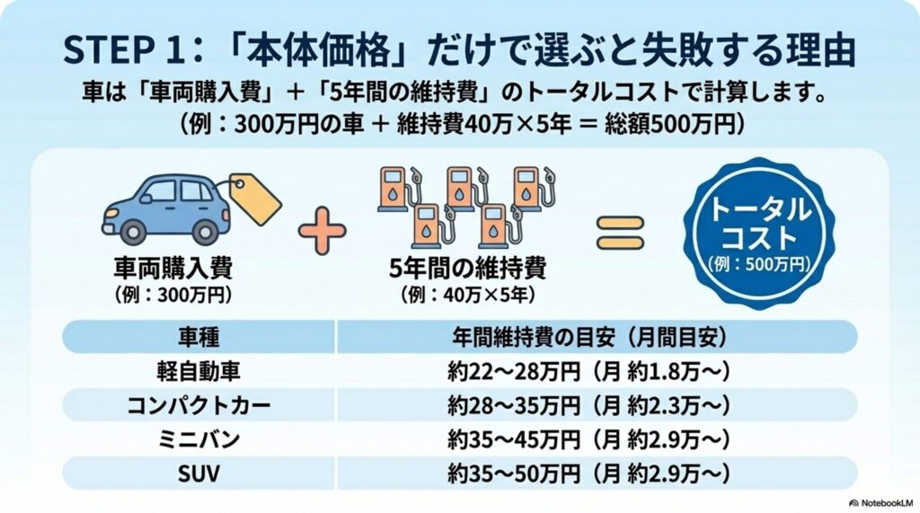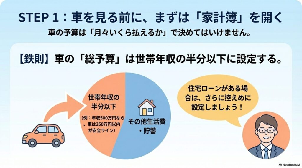 - STEP 1(予算): 年収の半分以下が車両の上限。「車両価格+5年間の維持費」のトータルコストで考える