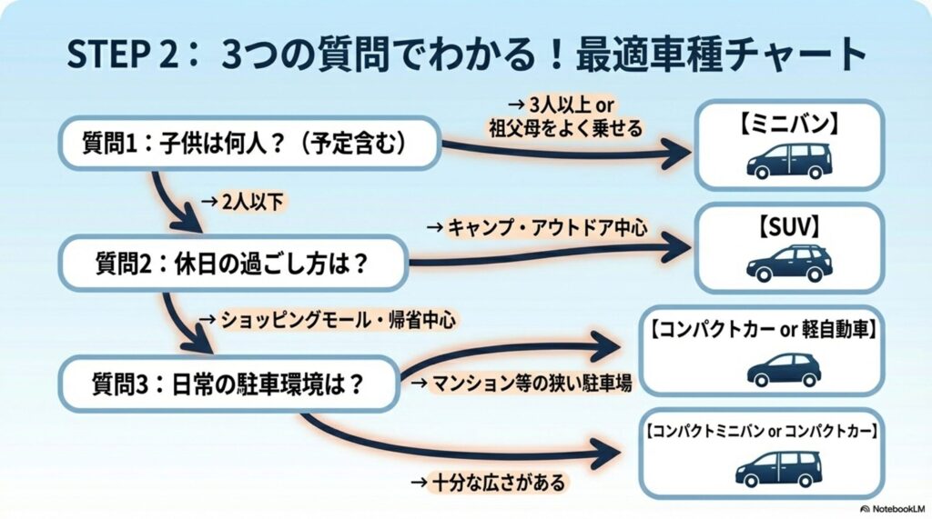 - STEP 2(車種): 家族の人数×休日の過ごし方×駐車環境の3つで「ミニバン/SUV/軽/コンパクト」に絞れる