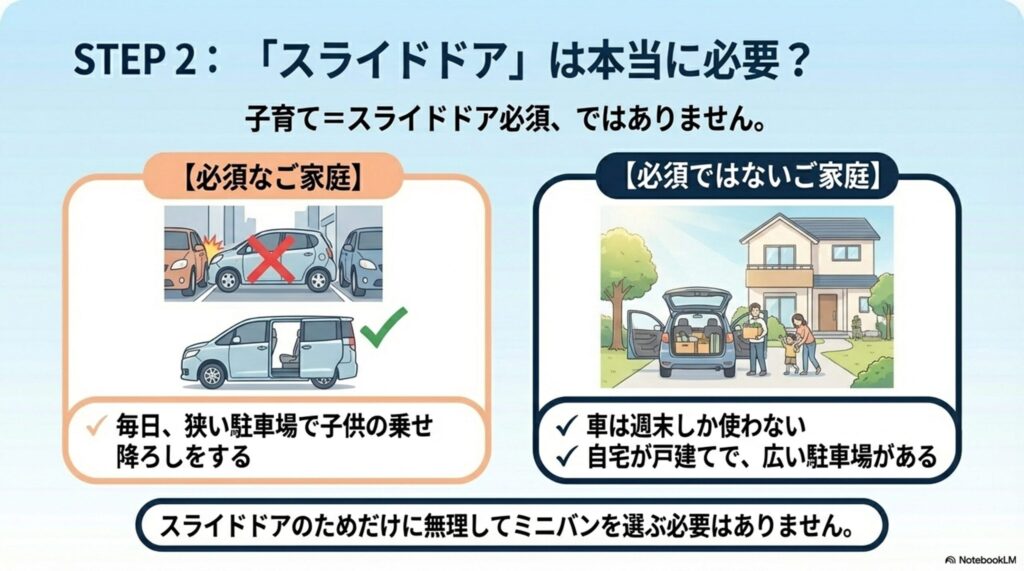 子育て車選びで最も議論になるのがこのポイント。結論から言うと、毎日狭い駐車場で子供の乗降をする家庭には必須です。