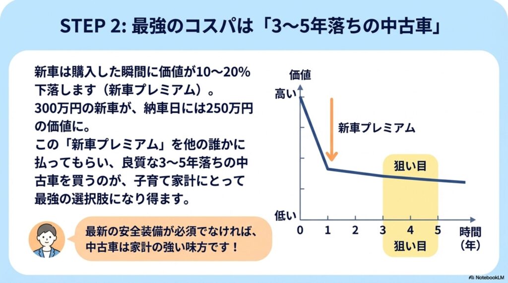 新車は購入した瞬間に価値が10~20%下落します。つまり、300万円で購入したノアが、納車日に中古車としての価値は250万円程度。この「新車プレミアム」を他の誰かに払ってもらい、3年落ちの良質な中古車を200万円台で買う方が、家計としてはよほど賢い。