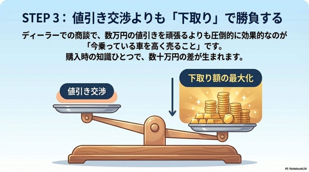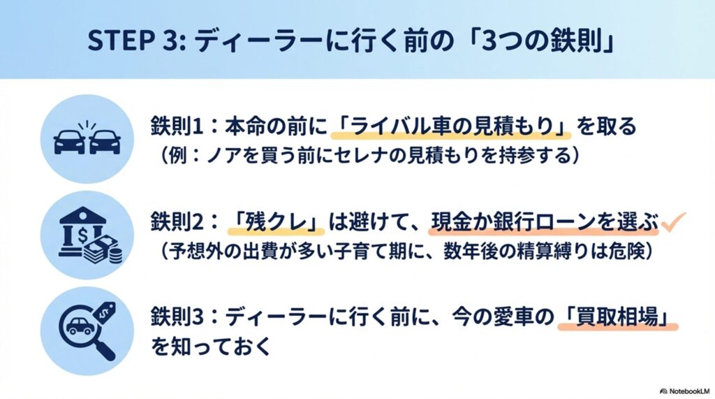 - STEP 3(購入): 残クレは慎重に。値引き交渉よりも下取り額の最大化がカギ