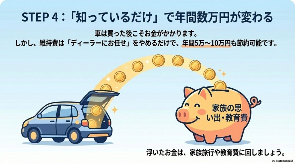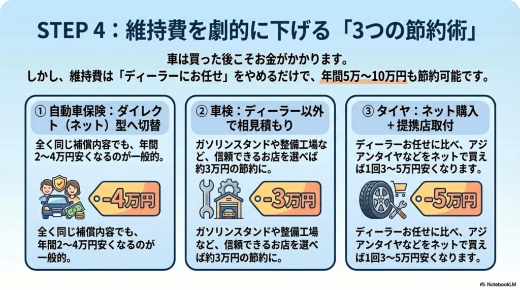 - STEP 4(維持): 保険のダイレクト型切替・車検の相見積もり・タイヤのネット購入で年間5~10万円の差