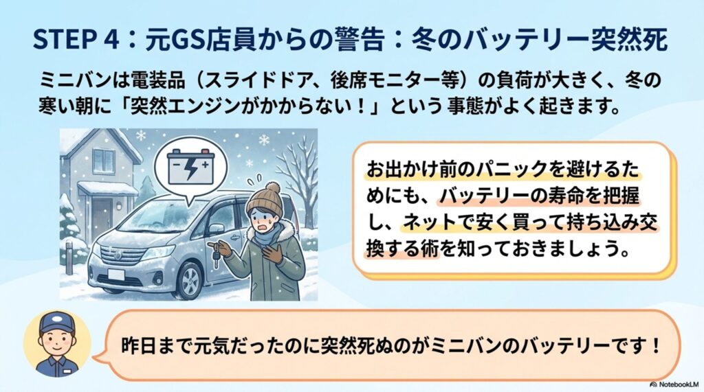 ミニバンのバッテリーは電装品の負荷が大きいため、「昨日まで元気だったのに突然エンジンがかからない」ということが本当にあります。特に冬場。チャイルドシートに子供を乗せて出発しようとしたら……という最悪のシーンを避けるために、バッテリーの寿命と賢い交換方法を知っておいてください