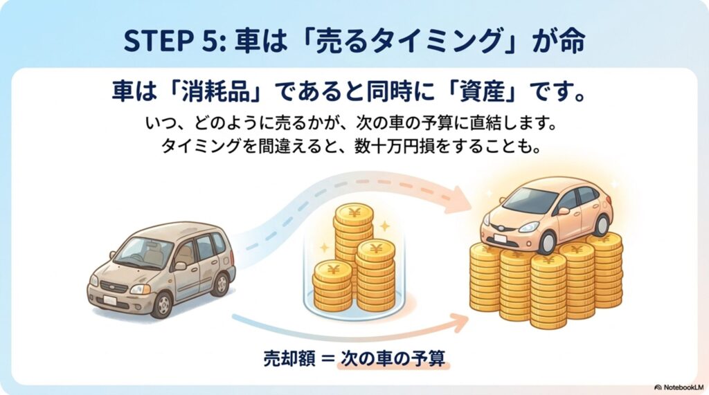 車は「消耗品」であると同時に「資産」でもあります。3~5年のサイクルで乗り換える家庭にとって、売却のタイミングと方法は次の車の予算に直結する超重要ポイント。