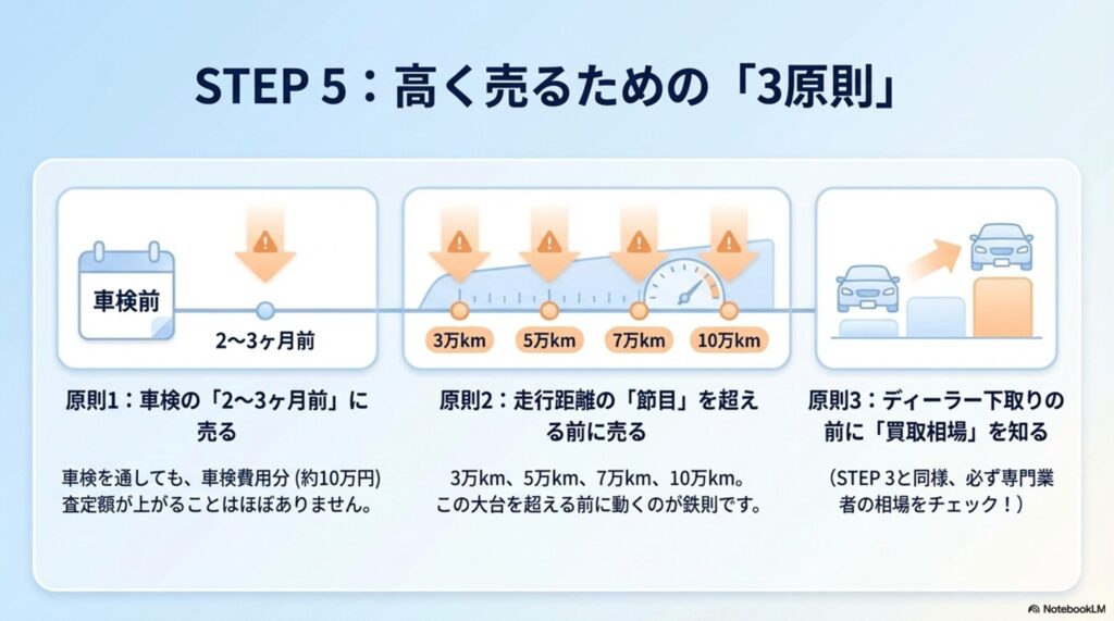 - STEP 5(売却): 車検前に売る。ディーラー下取りの前に必ず買取相場をチェック