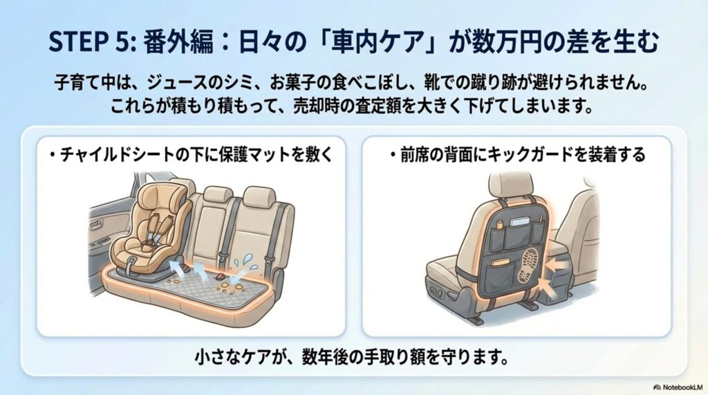 チャイルドシートの下にマットを敷く、キックガードを装着する、汚れたらすぐに拭く。こうした小さなケアが、3年後・5年後の「手取り額(売却額)」を数万円変えます。