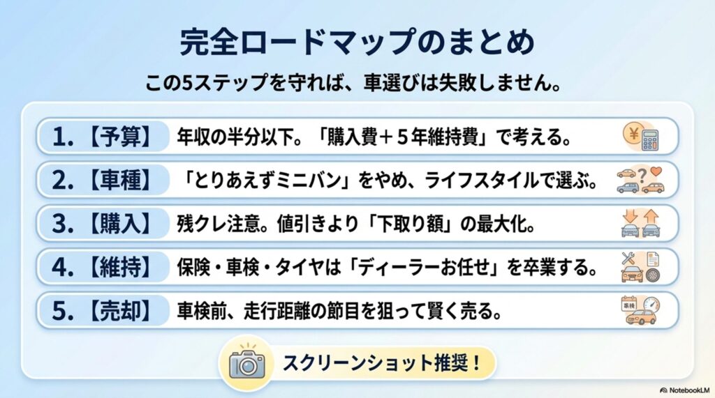 【結論】子育て中の車選びは「予算(家計から逆算)→ 車種(ライフスタイルで絞る)→ 買い方(残クレは要注意)→ 維持(保険と整備を賢く)→ 売却(タイミングが命)」の5ステップで考えれば失敗しません。この記事は、その全体像を1本にまとめたロードマップです。