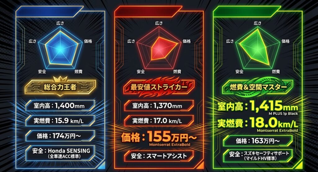 - N-BOX: 総合力No.1。走り・静粛性・安全装備の完成度はトップ。ただし2026年秋にビッグMC予定。今買うか、秋を待つか