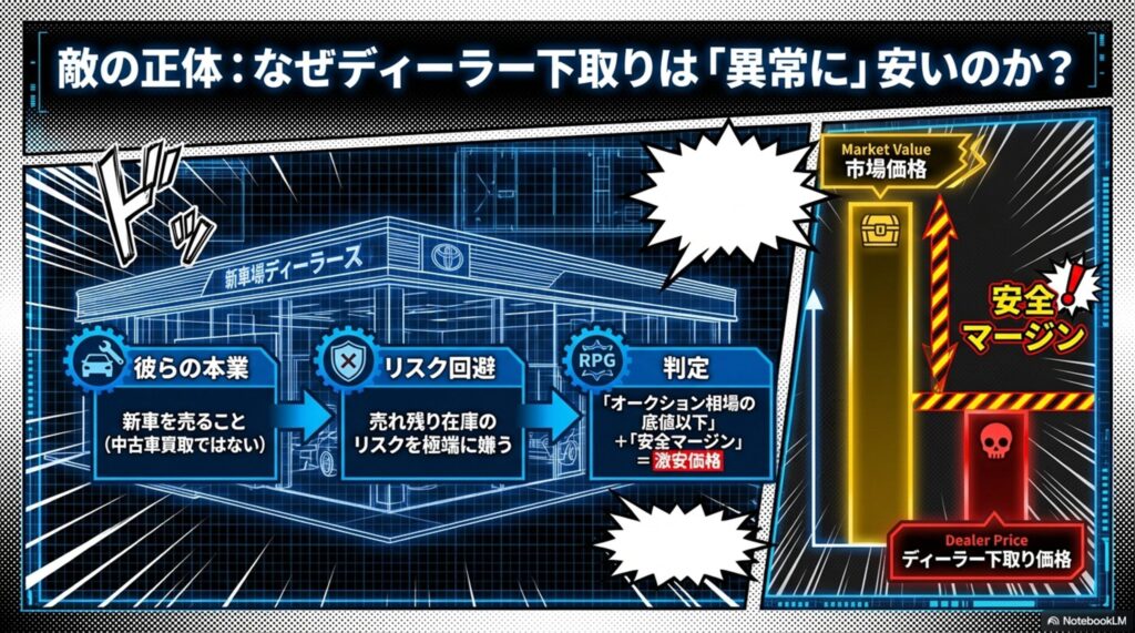 まずは、なぜディーラーの提示する金額が、一般的な相場よりも異常に安いのか。その「仕組み」を知っておく必要があります。