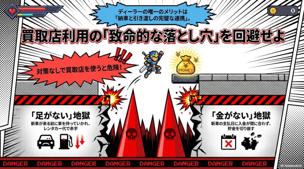 一方、ネットの査定サービスや外部の買取店を使う場合、何の対策もせずに契約してしまうと、以下の致命的なトラブル(落とし穴)が発生するリスクがあります。