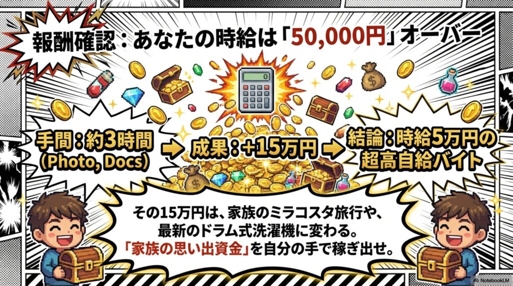 これは、単なるお金儲けの話ではありません。あなたの「数時間の少しの手間」を、家族旅行や新しい家電といった「家族の思い出資金」に変えるための、最も賢く確実な選択の話です。