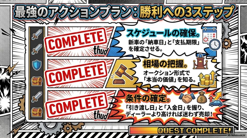 - スケジュールの確認: 新車の担当者に「支払いの期限」と「納車予定日」を明確に確認する。