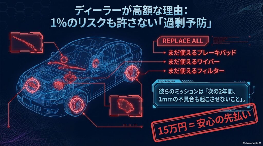 誰もが抱くこのイメージですが、見積もりが高額になるのには明確な理由(ビジネスモデル)があります。それは、ディーラーの整備方針が「過剰なまでの予防整備(まだ使える部品もガンガン交換する)」を基本としているからです。