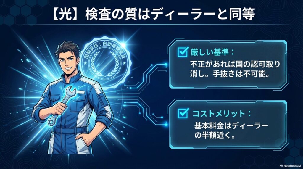 そのため、保安基準(ブレーキの効き、ライトの光軸、排気ガスなど)に関する検査の厳格さ自体は、ディーラーと何ら変わりません。むしろ、基本の「車検代行手数料(基本料金)」がディーラーの半額近くに設定されているため、合格ラインの整備だけをすれば驚くほど安く仕上がります。