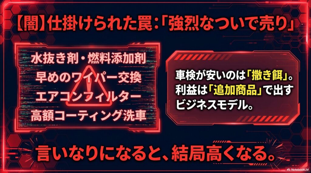 これがGS車検の最大の罠です。GS車検の基本料金が安い理由は、「車検で安いと見せかけて来店させ、他の商品(タイヤ、コーティング、オイル添加剤)をたくさん売りつけてゴッソリ利益を出す」というビジネスモデルだからです。