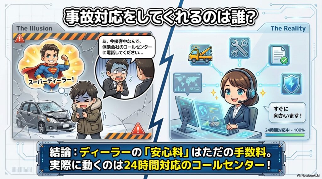 結論:事故対応をしてくれるのはディーラーではなく、保険会社のコールセンター。ディーラーの担当者は「書類の手続き」を手伝ってくれるだけ。つまりディーラーで入る「安心料」は、実質的にただの手数料。
