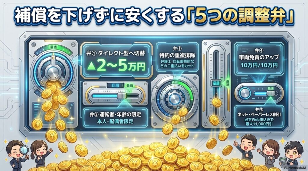 - 補償を下げずに安くする5つの調整弁: ①ダイレクト型に切替 ②運転者限定 ③特約の二重払い排除 ④車両保険の免責アップ ⑤ネット割引フル活用