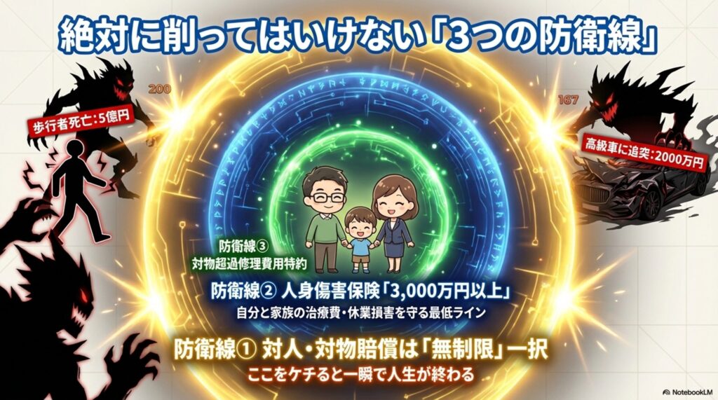 - 絶対に削ってはいけない3つの防衛線: 対人対物の無制限、人身傷害3,000万円以上、対物超過修理費用特約