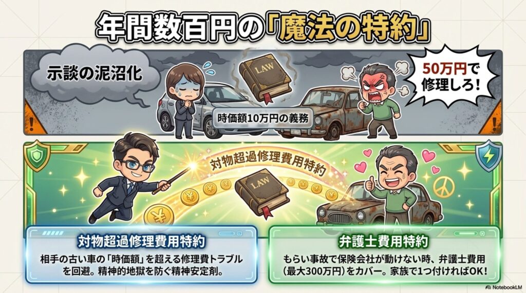 「相手が納得せずに示談が長引く」という精神的地獄を、年間たった数百円で回避できる。 これは「保険」というより「精神安定剤」です。