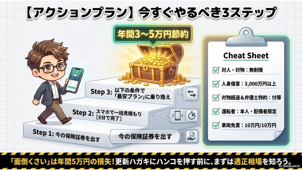 この記事を読めば、補償を1円も下げずに保険料を半額にするための「5つのステップ」が完全にわかります。