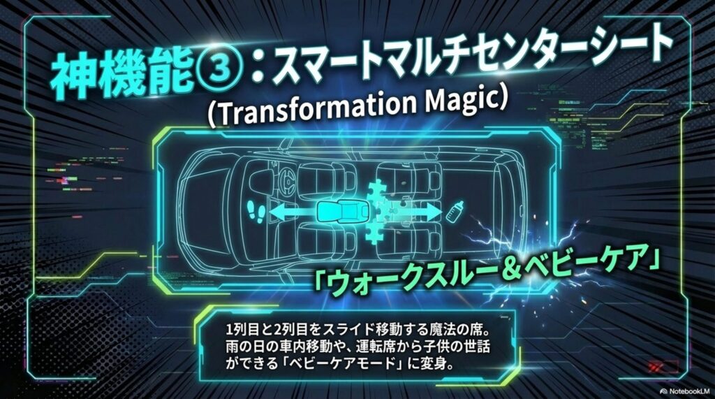 S-ハイブリッド車に搭載されているこの機能。「1列目と2列目の間を自由にスライド移動できる魔法のセンターシート」です。