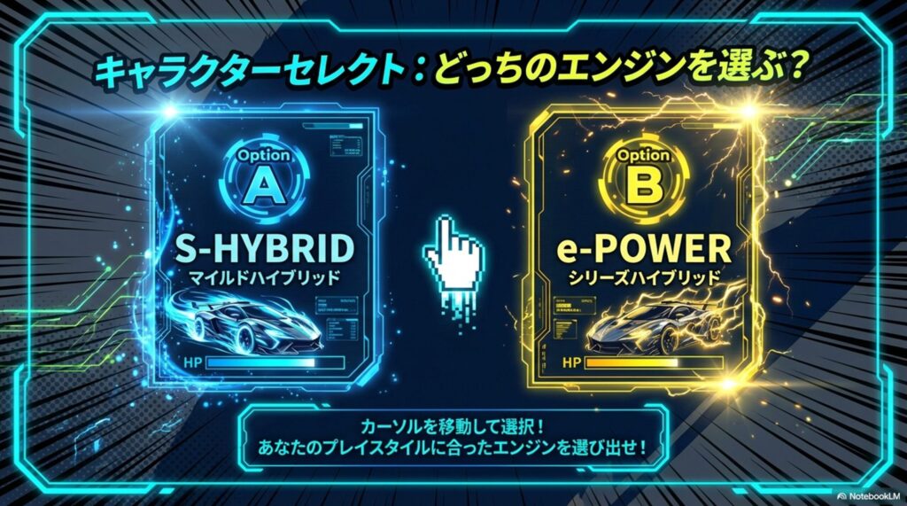 | 比較項目 | S-HYBRID (マイルドハイブリッド) | e-POWER (シリーズハイブリッド) |