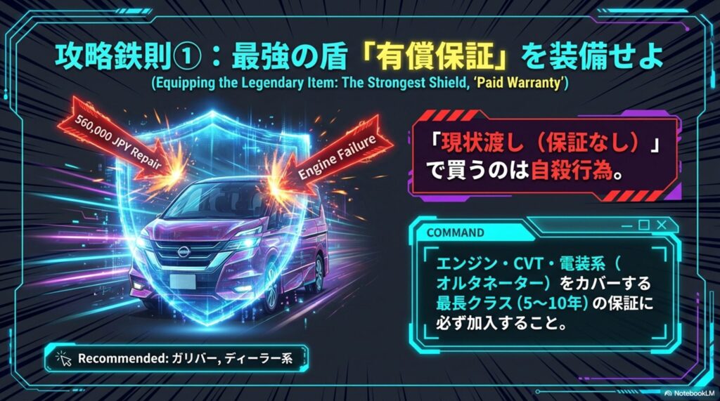 これが最大の防衛策です。セレナの中古車を買う際は、絶対に「エンジン・ミッション(CVT)・電装系(オルタネーター)」がカバーされる、最長クラス(5年〜10年)の保証に入ってください。