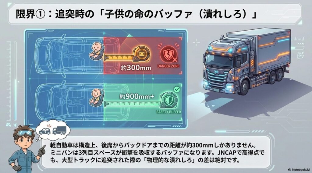 軽自動車の構造上、後部座席からバックドアまでの距離(クラッシャブルゾーン)が極端に短い。ミニバンには3列目シートの後ろにさらに荷室があり、そのスペースが衝突エネルギーを吸収する「バッファ」になります。軽にはそれがない。