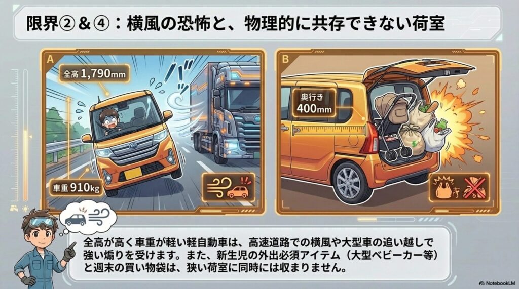 軽スーパーハイトワゴンは「背が高くて軽い」。N-BOXの車重は約910kg、全高は1,790mm。これは物理的に「風の影響を受けやすい形状」そのもの。